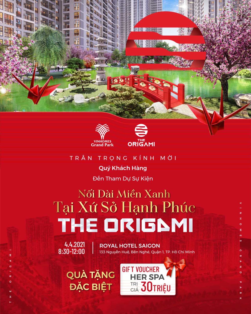 Ann Home – Đơn vị phân phối F1 dự án Vinhomes Grand Park trân trọng kính mời Quý khách hàng tham dự Sự kiện “Nối dài miền xanh tại xứ sở hạnh phúc The Origami” diễn ra vào ngày thứ 7 tại Khách sạn Kim Đô Quận 1 vào ngày 04/04/2021 tới đây.