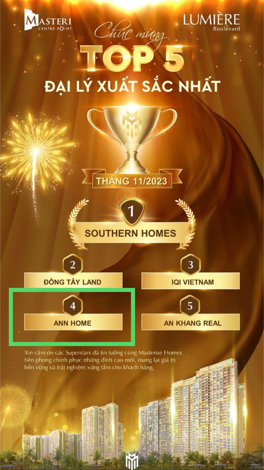 Cuối tháng 11/2024, đại diện chủ đầu tư Masterise Homes đã vinh danh cho các đại lý đã có những thành tích bán hàng xuất sắc trong tháng. Nổi bật trong số các đại lý được vinh danh của Masterise Homes là Ann Home – TOP 5 đại lý bán hàng xuất sắc nhất.