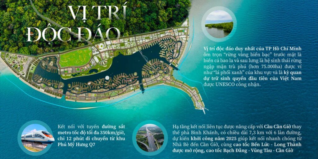 Nổi bật với lợi thế “tựa rừng – hướng biển”. Dự án còn được hưởng lợi trực tiếp từ các công trình hạ tầng trọng điểm tại Cần Giờ. Đây chính là “cú hích kép” giúp giá trị bất động sản tăng trưởng bền vững.