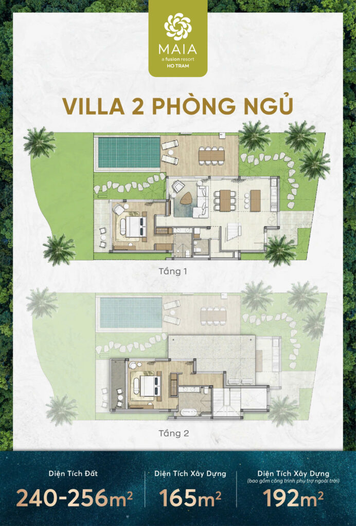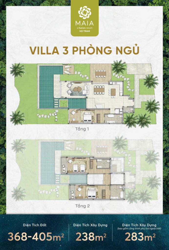 Villa 3 phòng ngủ tại Maia Resort Hồ Tràm là lựa chọn lý tưởng cho gia đình yêu thích không gian rộng rãi và sự riêng tư tuyệt đối. Mỗi căn villa sở hữu diện tích đất từ 368m² đến 405m², mang đến khoảng sân vườn lớn cùng tầm nhìn thoáng đãng hướng ra cảnh quan tự nhiên.