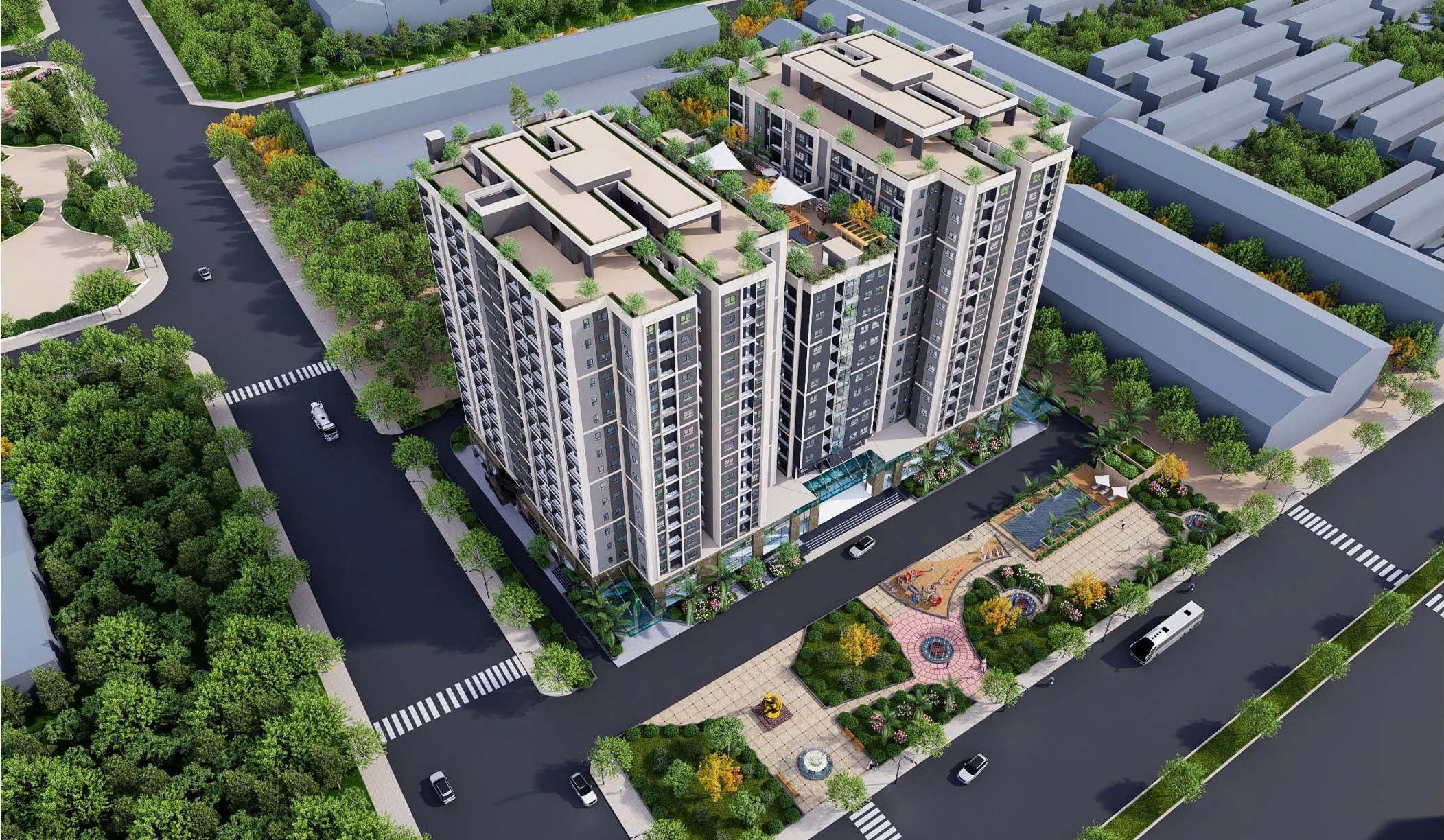 - Công viên nội khu rợp bóng cây xanh, mang lại bầu không khí trong lành cho những buổi dạo bộ, tập thể dục hay trò chuyện cùng hàng xóm.