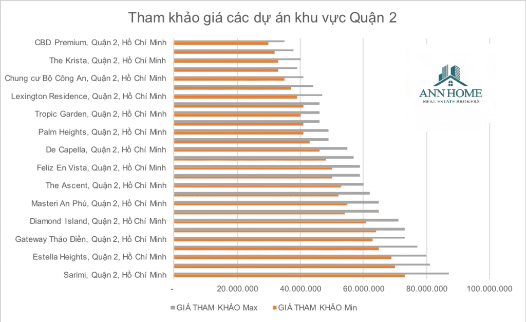 Mức giá cao nhất được ghi nhận tại các dự án căn hộ Quận 2 thuộc về dự án Sarimi Sala lên tới 87tr đồng/m2. Các dự án nằm trong khu vực Thảo Điền giữ mức giá trên trung bình khu vực từ 60-80tr đồng/m2. Tại các khu vực khác nhau mức giá trung bình sẽ tuỳ theo vị trí, thời gian nhận bàn giao và chủ đầu tư, từ mức thấp nhất là 30tr đồng/m2 tại dự án CBD Premium đến 87tr đồng/m2 tại dự án Sarimi và 81tr đồng/m2 của One Verandah Mapletree.